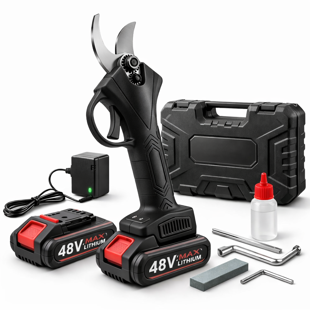 1 x nůžky1 x nabíječka2 x 48V li-ion baterie, 1,5Ah, 21V1 x mazivo2 x klíč1 x brousek na naostření1 x kufřík