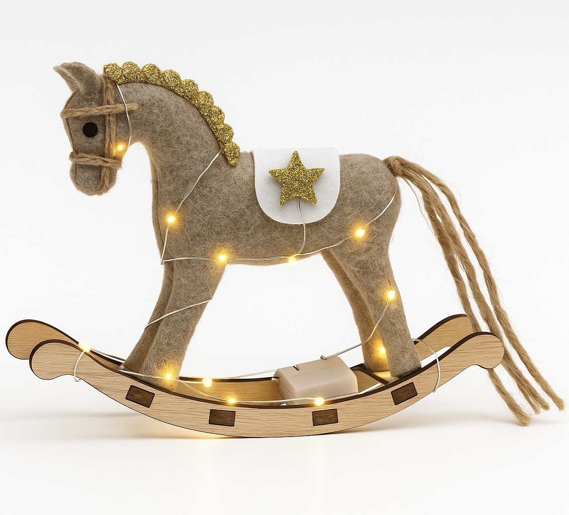 Rozzařte dětský pokoj i celý domov kouzlem Vánoc. Náš světelný vánoční LED houpací koník z přírodních materiálů spojuje dřevo, plst a jutový provázek do jedinečné dekorace, která působí hřejivě a přirozeně. Koník je omotaný 20 teplými LED diodami, které vytvářejí příjemné, uklidňující světlo – ideální jako vánoční dekorace i jemná noční lampička pro děti.