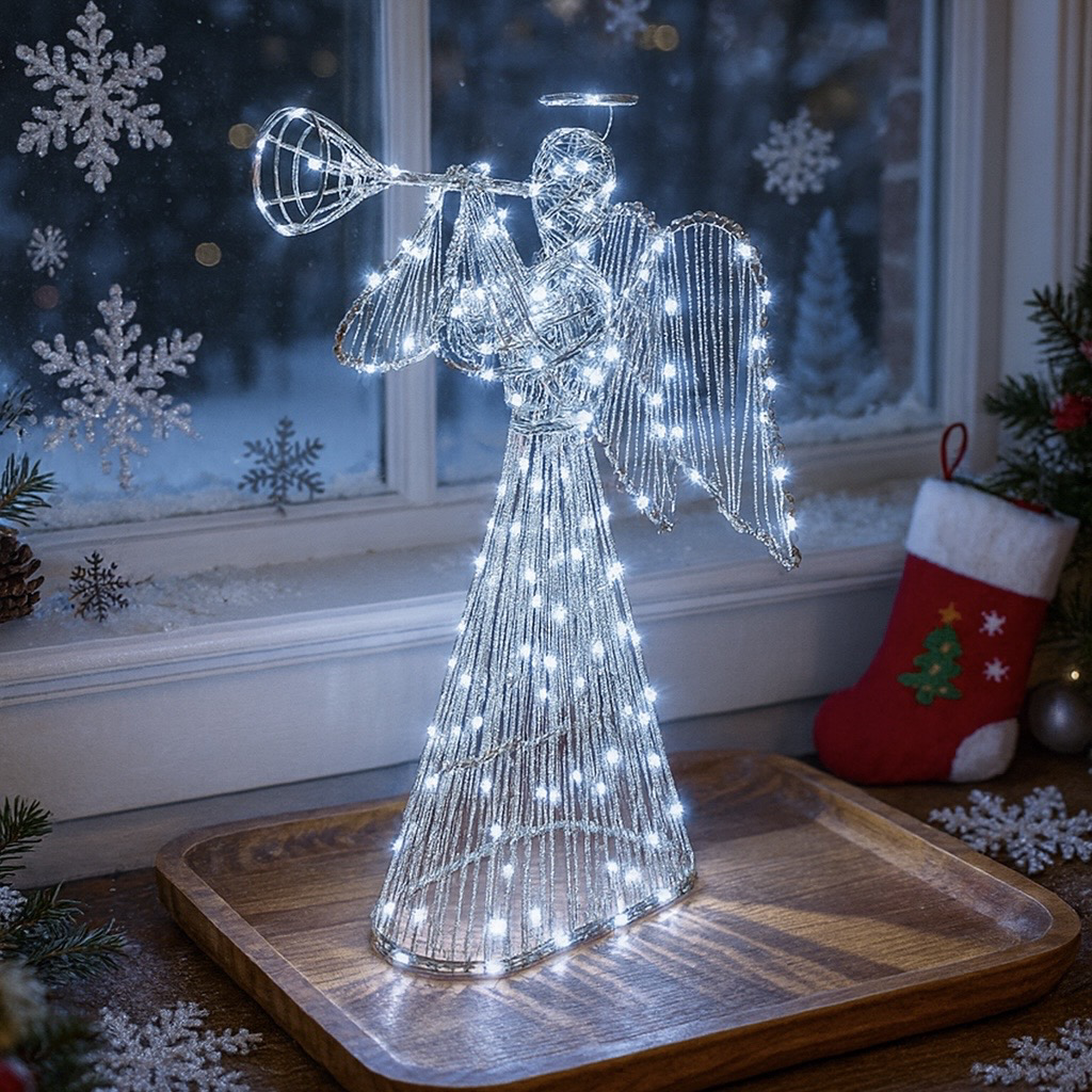 Na výběr jsou dvě světelné varianty: teplá bílá (zlaté provedení konstrukce) a ledově bílá (stříbrné provedení). Pokud chcete hřejivou, tradiční sváteční atmosféru, zvolte zlatého anděla s teplou bílou – je naše nejoblíbenější varianta pro rodinné domy i kavárny.